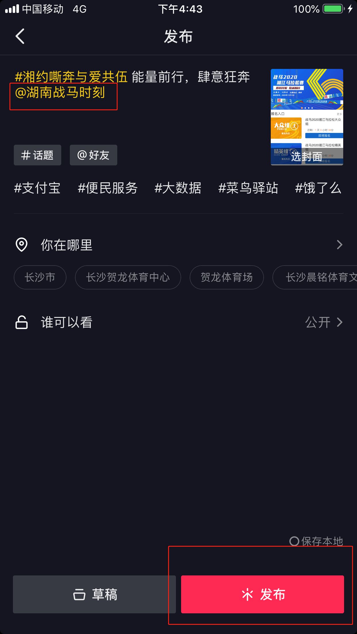 第三步:添加话题#湘约嘶奔与爱共伍,并@湖南战马时刻,点击发布即可。